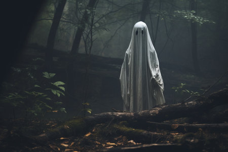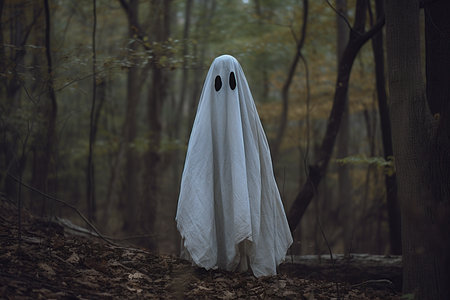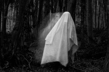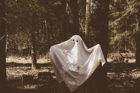Funny ghost in a dark forest. Dark fantasy concept. Of a mysterious white ghost in a spooky forest.