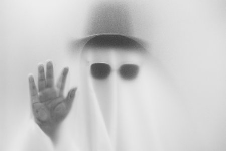 Horror ghost man behind the matte glass. Halloween festival concept.