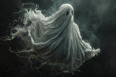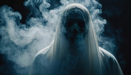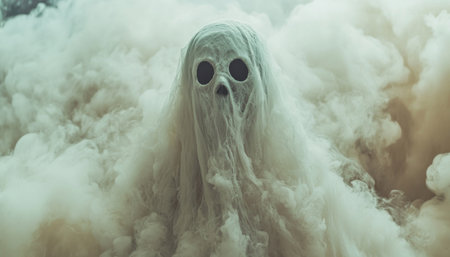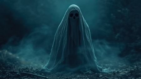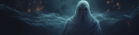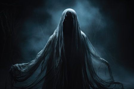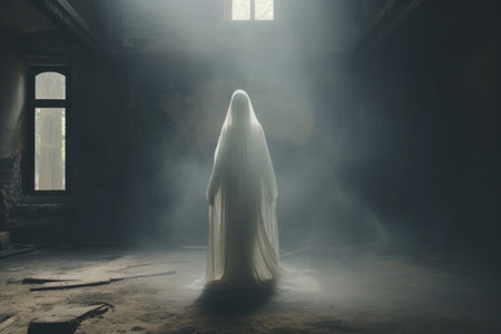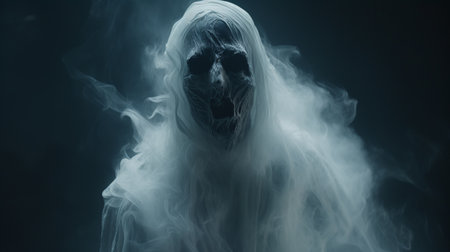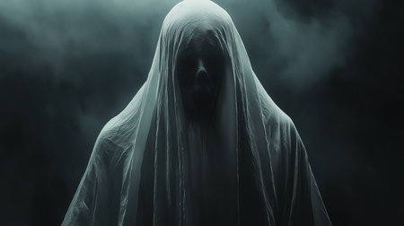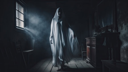 Ghostly figure looms in the dark. Swirling mist. Eerie atmosphere. Ghost drapes a flowing, translucent gown that blends into the fog, creating an unsettling visual. Feeling of fear and mystery. AI.