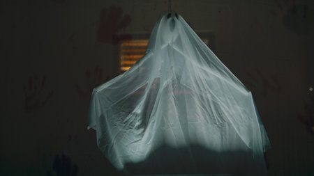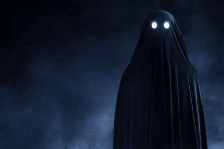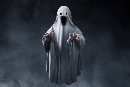 Scary ghost with a white sheet is surrounded by fog