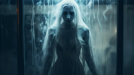 Horror ghost woman behind the matte glass. Halloween festival concept.