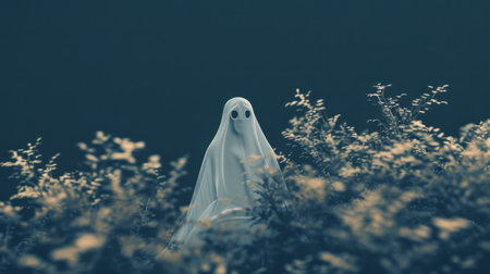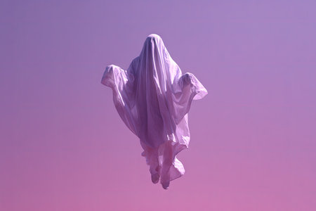 A ghost-like figure, formed from a draped white sheet, appears to float against a soft gradient sky. The image emphasizes a whimsical, slightly unsettling quality. The composition employs a minimalist approach, with an overhead perspective. Ideal for conceptual designs, illustrations, and potentially, seasonal marketing materials.