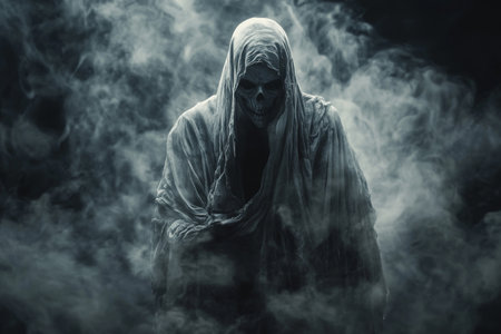 Mysterious portrait of the grim reaper cloaked in smoke, veiled face, and dark atmosphere