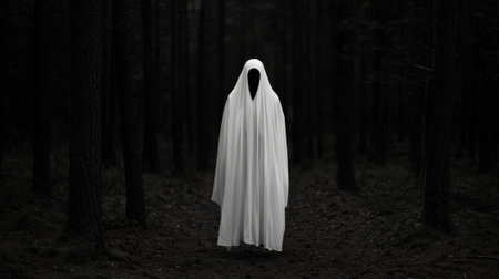 A moody horror edit of a ghost with a sheet over it's head. Standing in a forest.