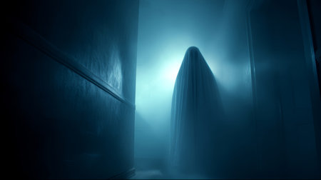 Ghost hallway silhouette mysterious eerie blue fog supernatural haunting fear ghostly figure draped white sheet stands dimly lit hallway