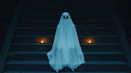 Mysterious Ghost Figure in White Sheet Seated on Dark Steps Surrounded by Flickering Candles in Eerie Dim Light Atmosphere