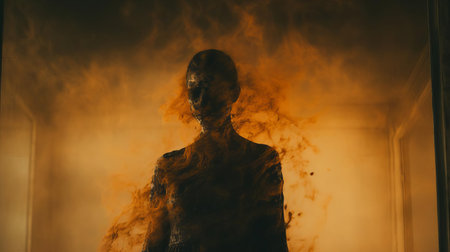 phantom alien with incredibly realistic features depicted in a terrifying horror movie still. the eerie lighting enhances the horrorcore aesthetic. this spooky apparition from outer space is sure to send shivers down your spine. ai generated