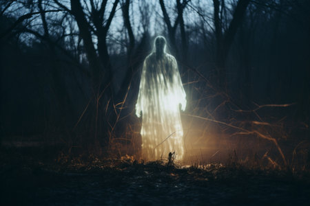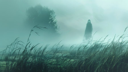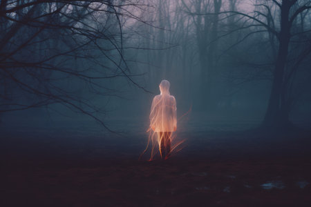 Mystical apparition of ethereal veiled figure in dark atmosphere.