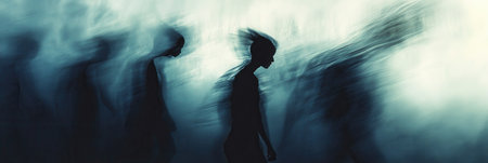 Dark tones and blurred shadows create an unsettling atmosphere filled with mysterious silhouettes that evoke fear and intrigue.