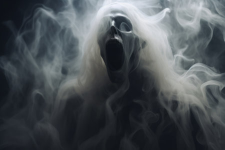 Three ghostly figures shrouded in white garments emerge from swirling mist in a darkened environment evoking a haunting atmosphere at night.
