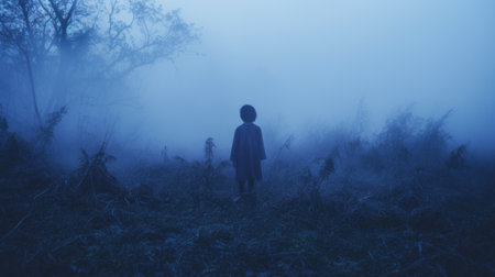 a person stands in the foggy field, gazing at the sky. this photo captures the essence of childhood arcadias with its dark gray and blue tones. inspired by japanese photography, it exudes a mysterious and haunting atmosphere. the image features a lit kid, reminiscent of a character from a horror film. with its low resolution, the intense color saturation adds to the overall impact. ai