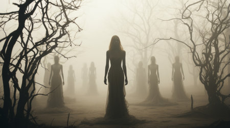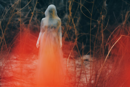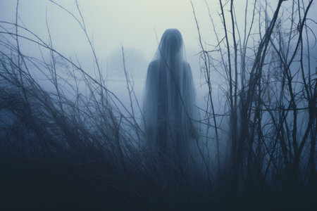 Mystical apparition of ethereal veiled figure in dark atmosphere.