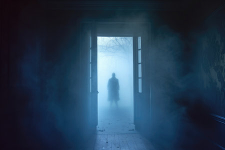 creepy foggy doorway with ghostly silhouette, created with generative ai