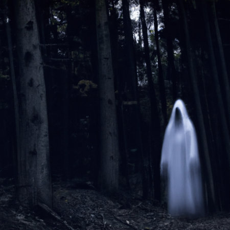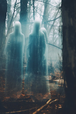 Hauntingly beautiful forest with ghostly apparitions among the trees