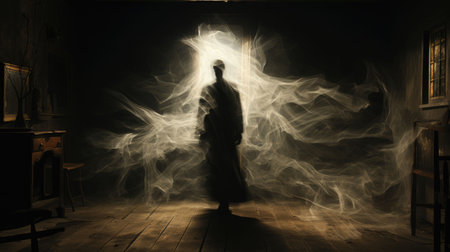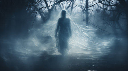 Ghostly horror background with dark atmosphere, shadowy phantom figure and chilling spooky mood, ideal for Halloween and scary design projects