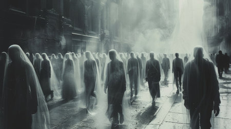 A crowded street scene with identical ghostly figures of a single person repeated throughout