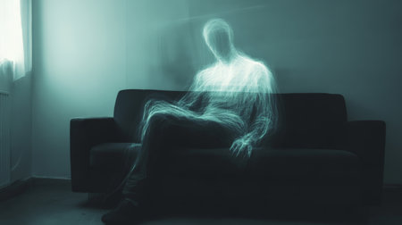 Blurry shadows and indistinct figures create a sense of unease, conveying an abstract interpretation of fear and mystery.