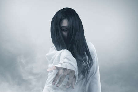 Horror scene of ghost woman death movie Halloween festival in the dark house nightmare screaming on hell is monster devil girl or female dead characters at night evil dressing wraith spirit theme.