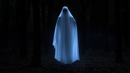 A moody horror edit of a ghost with a sheet over it's head. Standing in a forest.