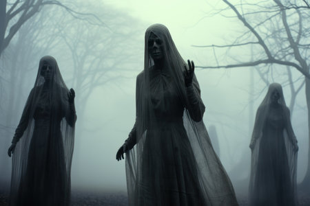 Ghostly apparitions materialize amidst a foggy graveyard, their ethereal forms a haunting reminder of the souls of the departed.
