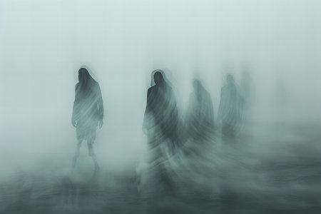 ghosts, shrouded in fog and rain, create an eerie atmosphere in this dark cyan and green photograph. reminiscent of horror academia and somber religious works, the image captures the dramatic presence of monumental figures. shot by anas asghar in stunning 8k resolution, it showcases the artistic vision of sebastian errazuriz. ai generated