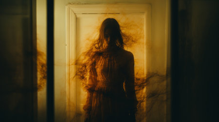 Heavily blurred shadow figure with an indistinct face, emerging from behind frosted glass, creating a gender-ambiguous and eerie horror scene.