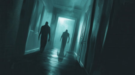Dark corridor with shadowy ghostly figures looms under an eerie flickering light, evoking a chilling sense of dread and suspense.