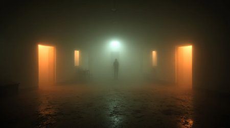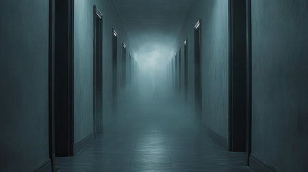 A foggy corridor in an abandoned building captures an eerie atmosphere with dim lighting and mysterious shadows, perfect for themes of isolation and exploration.
