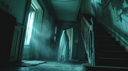 Ghost hallway silhouette mysterious eerie blue fog supernatural haunting fear ghostly figure draped white sheet stands dimly lit hallway