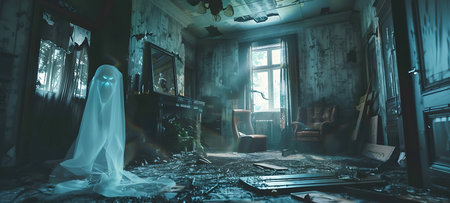 Ghosts in abandoned, haunted house. Horror scene of scary spirits, halloween concept.