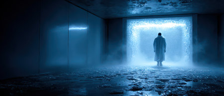 A lone figure in a long coat stands in a dark icy corridor illuminated by a glowing frosty doorway at night.