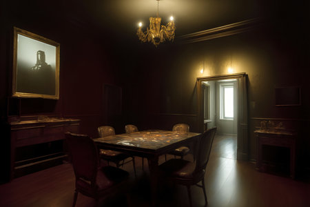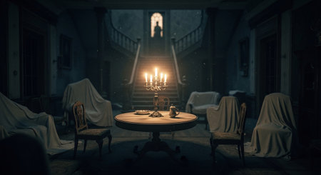 A hauntingly atmospheric room adorned with eerie lighting and cobwebs, perfect for Halloween-themed projects or horror stories.