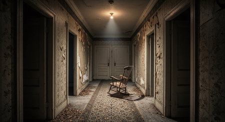 Abandoned Hallway with Single Armchair in Dramatic Light Beam