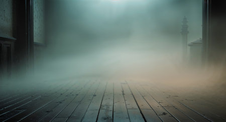AI Generated. Mist drifts across a wooden floor creating a mysterious atmosphere in a dimly lit space