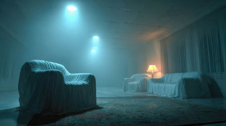Empty room with cold lighting, antique furniture, and a sofa covered in white sheets, evoking abandonment and stillness.