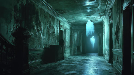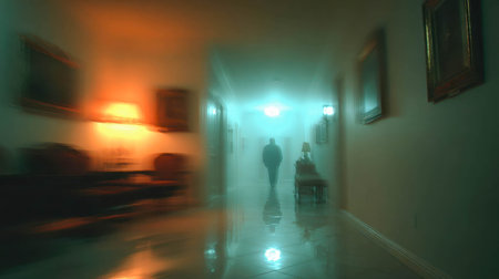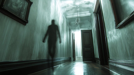 A dark and ominous hallway with a faint, blurry ghostly apparition standing in the distance, creating a chilling and suspenseful atmosphere. Ideal for horror, mystery, or supernatural themes.