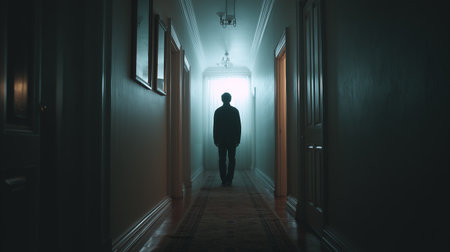 A dark shadow stands in a dimly lit hallway creating an eerie atmosphere