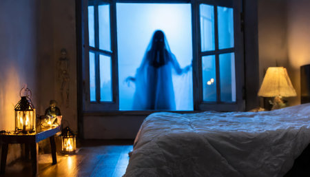 Eerie blurred ghostly silhouette stands at a bedroom window under the cover of night, evoking an unsettling, haunting atmosphere perfect for Halloween, horror stories, paranormal-themed