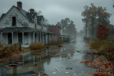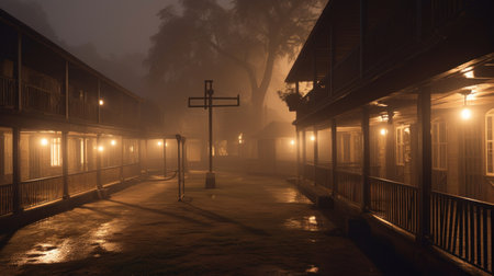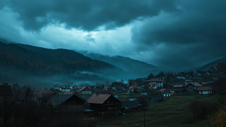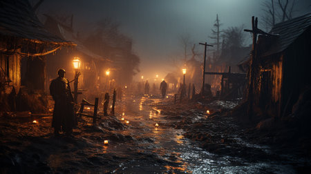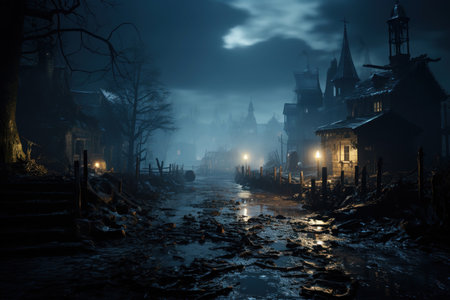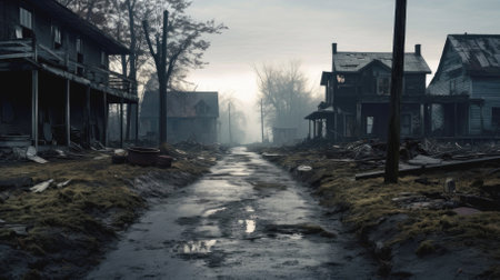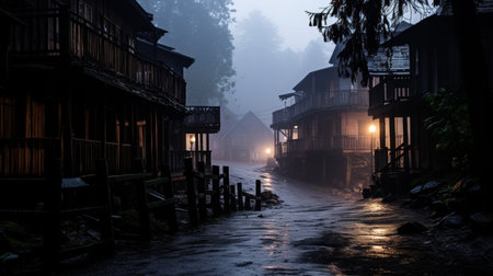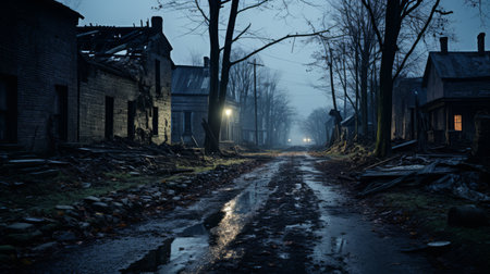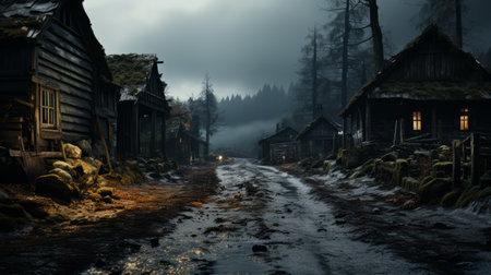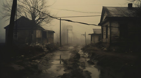 The small village is quiet and still, Small village weird and scary atmosphere. Generative AI.