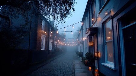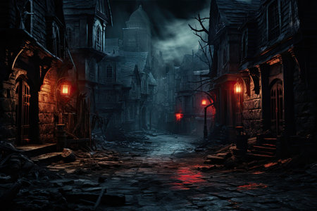 Mysterious dark alley with glowing lanterns. Halloween concept.