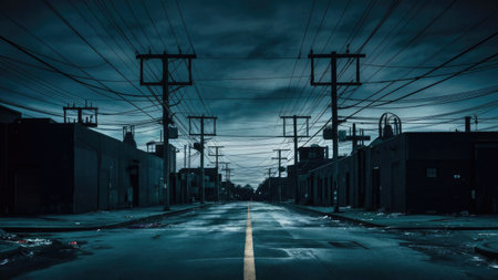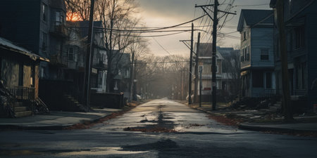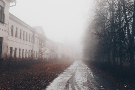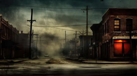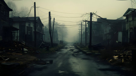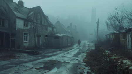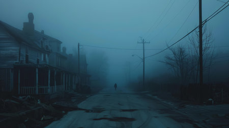 Desolate street in a foggy, abandoned town, shadowy figure at end. Twilight silence concept.