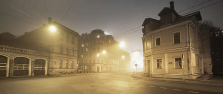 An empty illuminated asphalt road through the old historical buildings and houses in a fog at night. Street lights (lanterns) close-up. Riga, Latvia. Dark cityscape