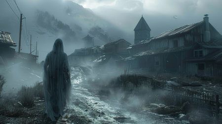A haunting zombie ghost with translucent skin drifting through a desolate village
