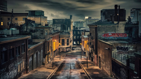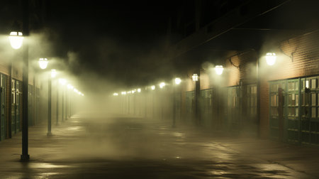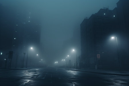 urban dark city enveloped in fog, creating a mysterious ambiance. A high quality image making by generative ai.