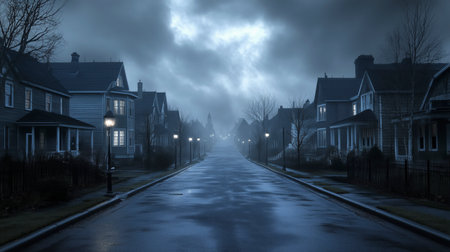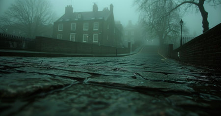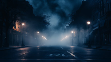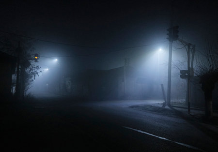 A quiet street is enveloped in thick fog, with dimly lit street lamps casting an eerie glow. Shadows play across the wet pavement, creating an atmosphere of mystery and intrigue.