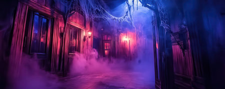A hauntingly atmospheric room adorned with eerie lighting and cobwebs, perfect for Halloween-themed projects or horror stories.