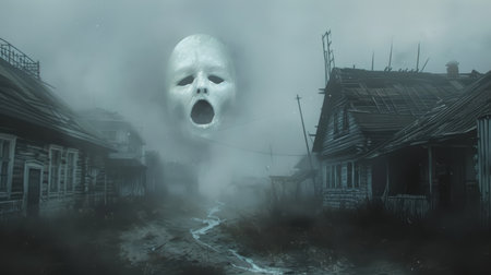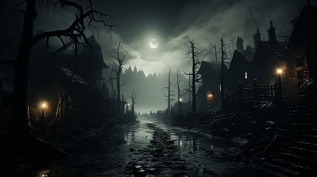 Digital depiction of a hauntingly eerie village street cloaked in thick fog at dusk