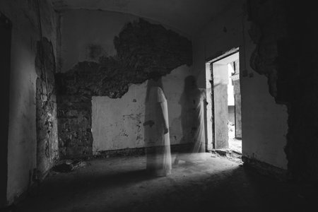 Ghost in abandoned, haunted house. Horror scene of scary spirit of a woman, halloween concept.