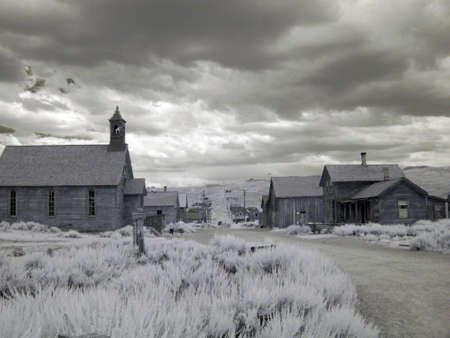 A deserted main street in an old ghost town lies beneath a clear sky, flanked by wooden buildings and distant mountains, creating a serene atmosphere.