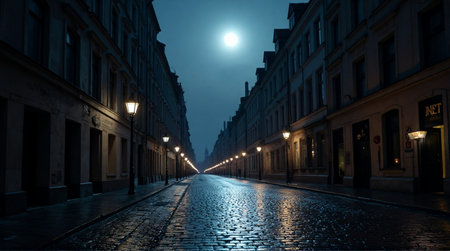 Experience the magic of a quiet European cobblestone street glowing under the moonlight at night